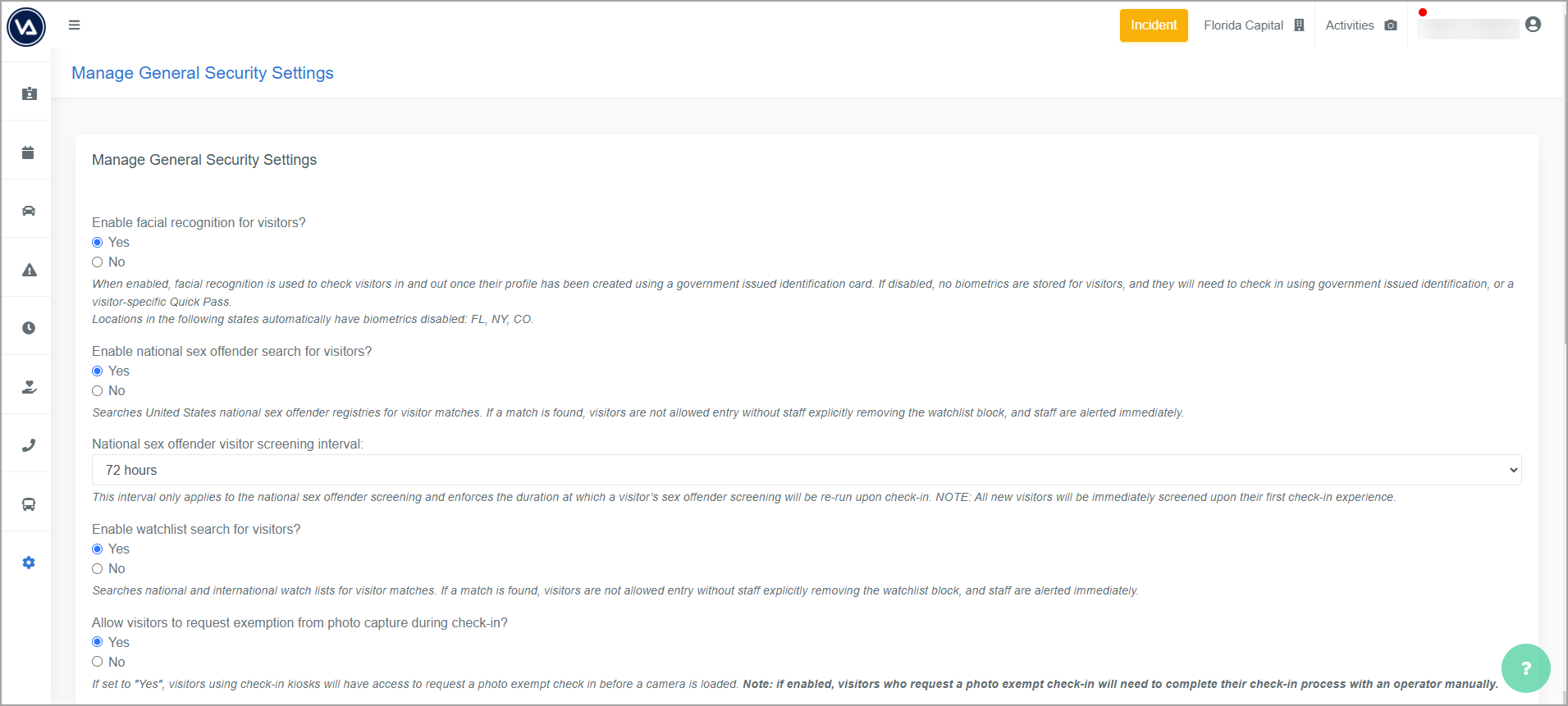 The Manage General Security Settings page allows you to configure various security settings for your Visitor Aware system. Use these settings to: